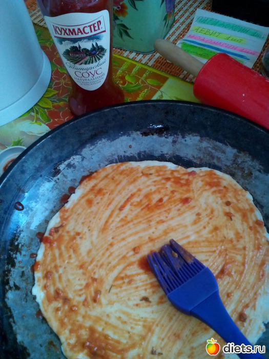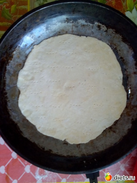 3) Постоявшее тесто раскатать, смазать маслом листик, сделать вилкой полупроколы (для лучшего впитывания соуса)