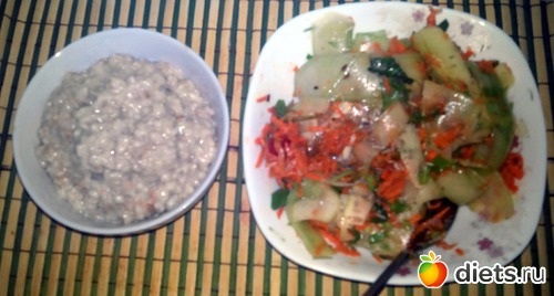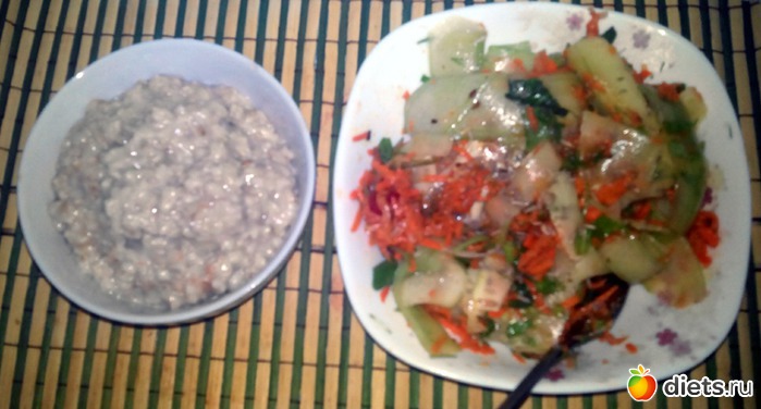 Геркулес с маслом, но без соли. Салат из огурцов и корейской моркови.
