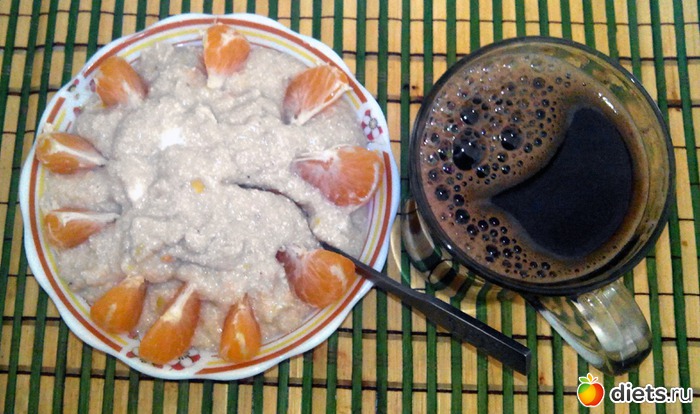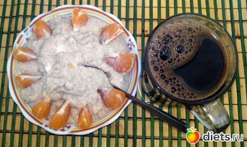 Кофе с сахаром, кардамоном и корицей. Творог, банан и яблоко. Измельчил в блендере - получилось весьма неплохо. Плюс мандаринка.