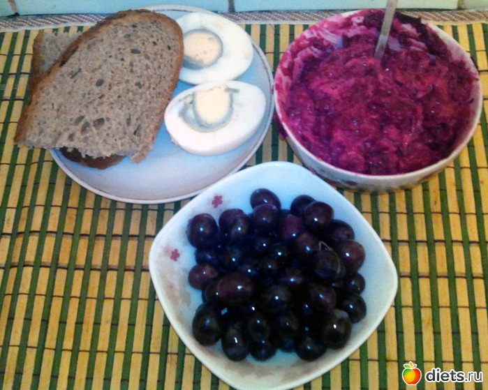 Свекла с чесноком. Хлеб. Яйцо. Виноград.