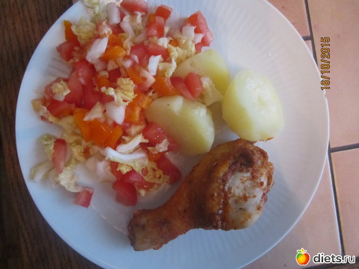4. картошка, куриная ножка из мультиварки, салат (пекинская капуста, помидор, сладкий перец, оливковое масло