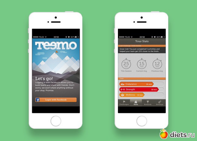 Приложение Teemo разработано в форме веселой и приключенческой игры. Чтобы начать упражнения, вам нужно будет зарегистрироваться в программе с помощью Facebook, других варантов разработчики не предлагают. После этого вам будут доступны все задания, например такие, как «Покорить Эверест» (хотя на самом деле вы будете ходить по лестнице). Прогресс в выполнении упражнений будет отображаться с помощью специального значка.