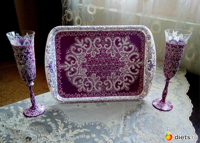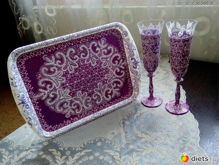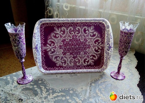 Вообще заметила, что с укорочением светового дня лени прибавляется. Хочется посиживать в уютном кресле и, к примеру, потыкивать контурами в разные предметы... Что я и делала вечерами в последнее время. В результате вдогонку к бокалам расписала поднос:
