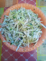 лук режем, добавляем в салат, перемешиваем, добавляем растительное масло, солим