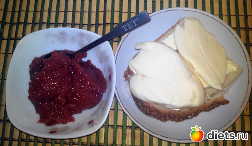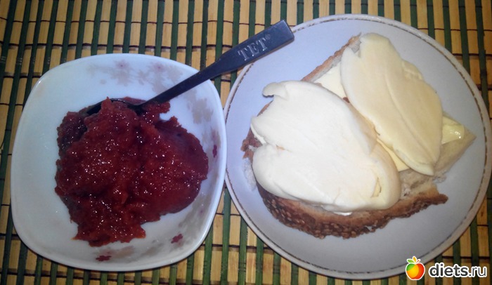 В это время мы как раз активно ремонтом занимались, поэтому был короткий перекус. Бутер с маслом и сыром. И немного грушевого джема. Как его считать не знаю, поэтому считаю только сахар.