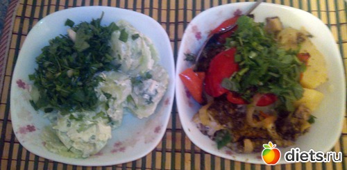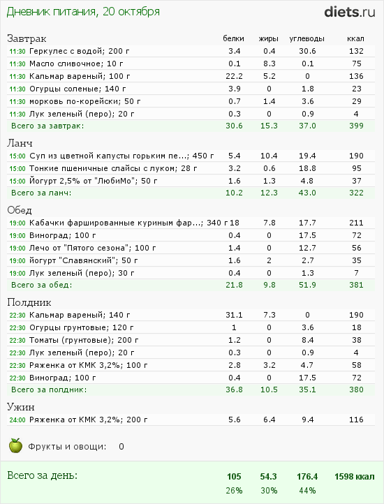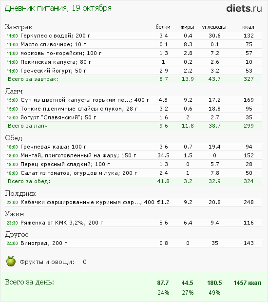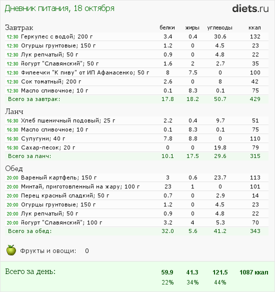 К сожалению, совсем вечер я, оказывается, не зафиксировал. Поэтому не удивляйтесь, что так мало. Смело прибавляйте где-то калорий триста.