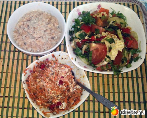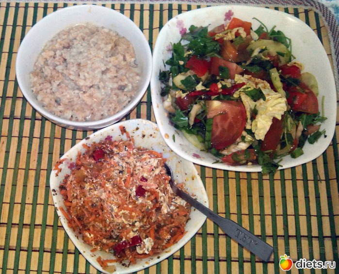 Геркулес с маслом. Салат. И немного корейской моркови с греческим йогуртом.