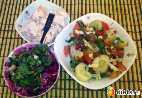 Салат. Отварная свекла с чесноком и йогуртом. Грудка отваренная на пару. У этого способа масса достоинств, например, он лучше всего сохраняет вкус, но до конца она так и не проваривается. Кой-какая краснота остается. И это не зависит от размеров грудки. Я варил и большую, и маленькую. Реально долго варил. Но добиться полной проварки так и не добился.