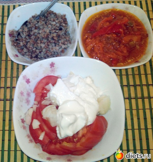 Гречка. Салат. И немного лечо. Плюс маленький бутер с греческим йогуртом.