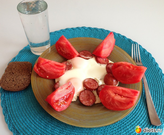 Мой завтрак : яичница с куриной колбаской и помидоркой с Крыма!