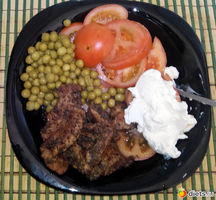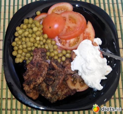 А еще в холодильнике нашелся кусочек мяса. Я его крутил-крутил туда-сюда, решая как бы его приготовить? Потом решил-таки поджарить. Но без масла. Почти сухим способом. "Почти" потому что пару раз добавлял некоторое количество воды. Мясо делал без соли, чтобы оно осталось сочным. Обвалял только в сухих травах. Ну и немного овощей и зеленый горошек. Немного греческого йогурта.