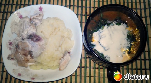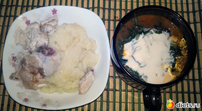 Остатки супа из цветной капусты. Картофельное пюре и грудка.