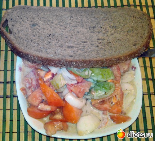 Салат с ряженкой и кусочек хлеба.