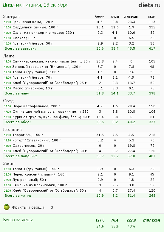 Вышло, конечно, многовато, но мой коридор от 2000 до 2200 килокалорий. Так что верхнего предела я не одолел.