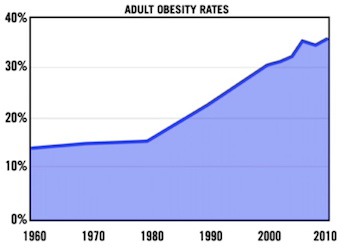 И вообще в последние несколько лет в мировом сообществе диетологов переворот. В этом году их конгресс снял ограничение на потребление жиров, которое было наложено примерно в 80-х годах. Вот диаграмма, показывающая рост ожирения среди взрослого населения США.