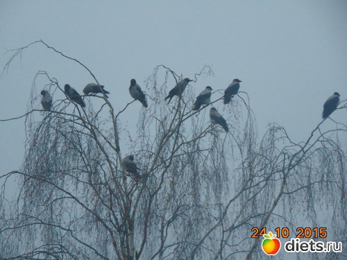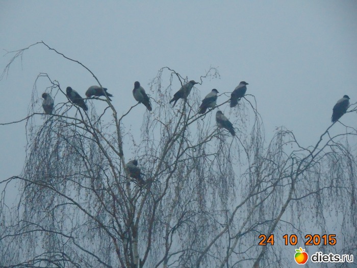 Вид из окна. Вороны под дождичком мокнут на березе.