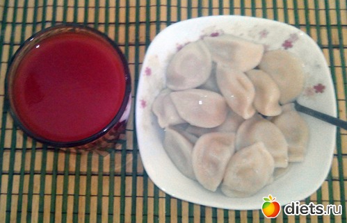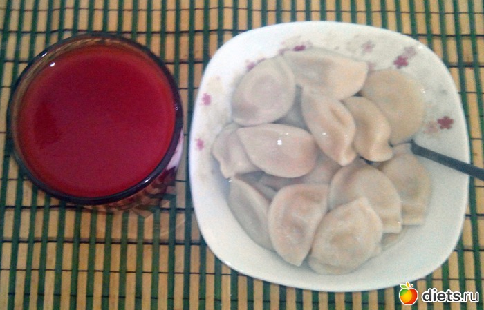 Вареники и томатный сок. Имейте в виду, что они вбирают воду и прибавляют в весе примерно наполовину.