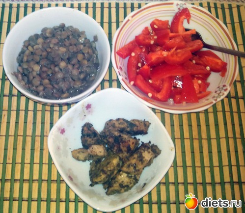 Перец, чечевица и грудка приготовленная на сухой сковороде. Кстати, нашел я ее настоящую калорийность.