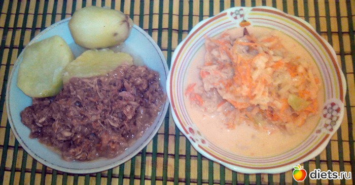 Картошка, тунец и салат из редьки, яблока и моркови.