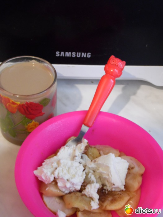 З кофе с молоком+яблоки с корицей и имбирем с микроволновки, после добавила творога. Кстати, открыла новое и очень вкусное блюдо для себя. Прям ем и балдею