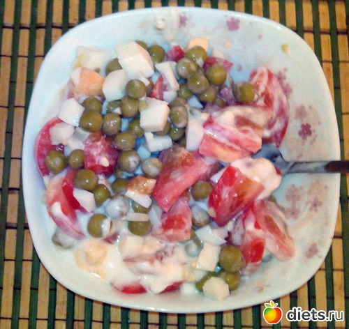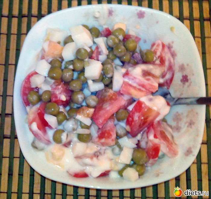 Соорудил себе салатик из яйца, помидорки, зеленого горошка и йогурта.