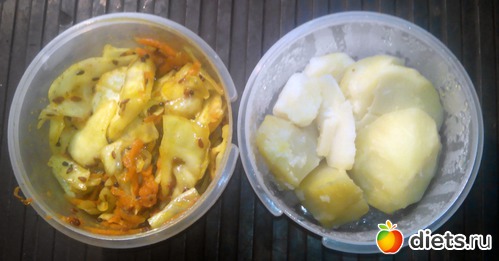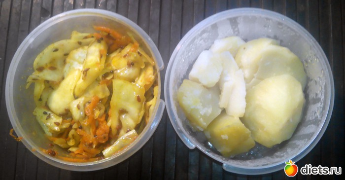 Капуста по-корейски. В этот раз мне удалось хорошо прожарить кунжут и я добился более выраженного вкуса от кунжута. И картошка.
