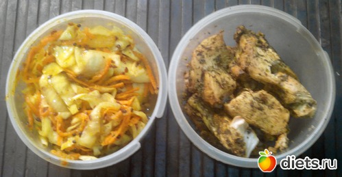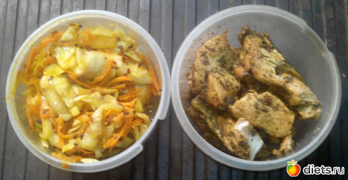 Еще порция капусты и грудка, жаренная на сухой сковородке. Кстати, именно поэтому я ее считаю как приготовленную на открытом огне, то есть без жира.