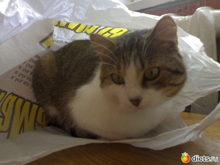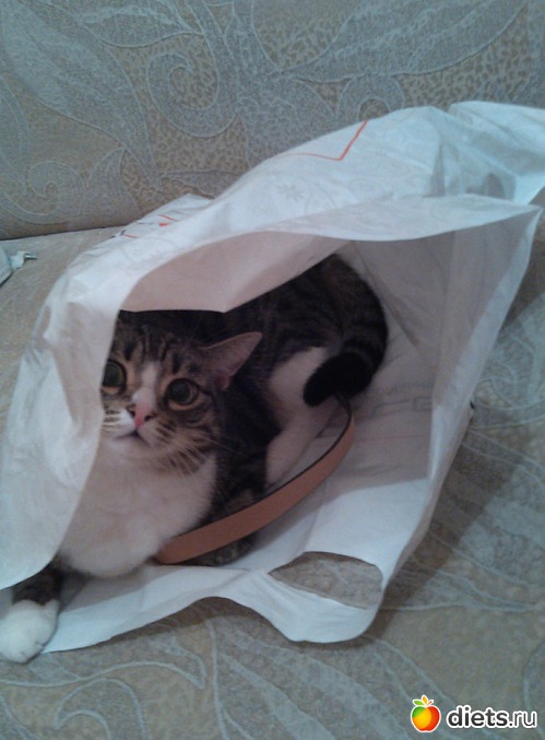 Пакет, как известно, одно из любимых мест обитания всех котожителей (это я достала пакет с платьем - примерить, а эта шкура тут как тут
