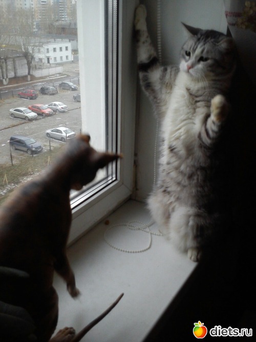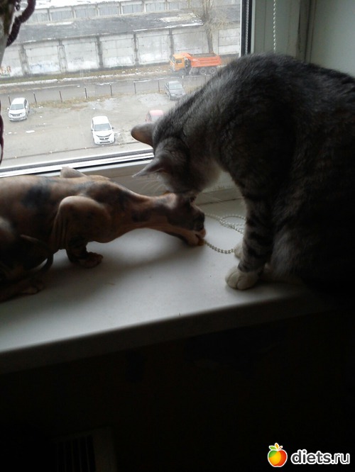 А здесь - кот моей подруги и временно переехавшая сфинксиха (Рексюша постоянно смотрит на оголённую девочку влюблёнными глазами!):