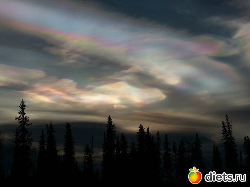 Да, загадочные свечения)) Я не один десяток лет живу в Приполярном городе, у нас не редкость северные сияния . А вот однажды я увидела днем радужное небо. Оно было серое,декабрь все же, но в разрывах серых облаков появилось вот такое перламутрово-радужное свечение, которое продолжалось довольно долго.