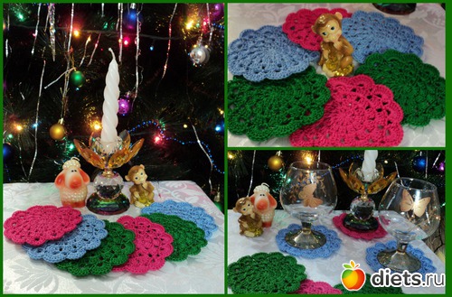 Замечательные работы! Варежки прям как для снегурочки! Аккуратные, милые, белые! Прям супер!!! Ну а подставочки ты ж сама знаешь, что для тебя вязать их - плёвое дело) Но на столе будут смотреться очень ярко и оригинально)