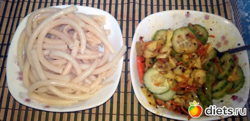Давно хотел вот таких макарон. С дырочкой... А еще смешал капусту по-корейски с равным количеством огурцов.
