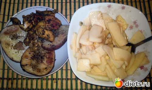 Запек сегодня сразу и грудку, и картошку. В два этажа. А еще я сегодня мариновал кабачок и у меня остался кусочек, который не вошел в банку. И что было с ним делать? Я его нарезал и заправил своей стандартной заправкой из соевого соуса, яблочного укуса и подсолнечного масла. Получилось весьма неплохо. Я даже пожалел, что замариновал оставшийся кабачок, ибо его можно было и так съесть в виде салата.