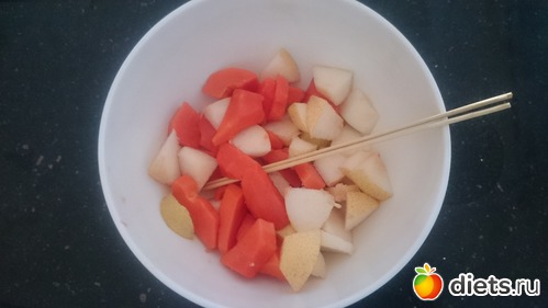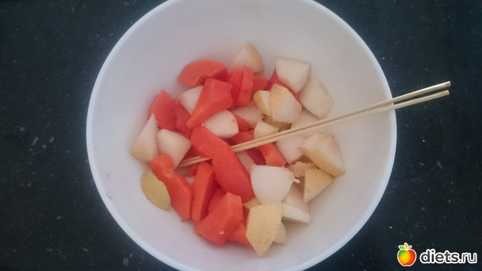 В 15 часов фруктовый салат, хотела сделать из кучи разных фруктов, но поняла, что все начну а возьму от них по 20 грамм и решила делать из 2-3, сегодня у меня папайя и китайская груша..по 100грамм итого 200 грамм..