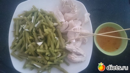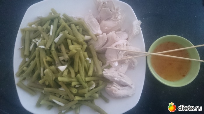 Обед 100 грамм вареной куриной грудки и 200 грамм отварной фасоли с чесноком (без масла) плюс немного соуса. Ела деревянными шпажками.