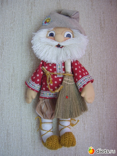 Куклы со смыслом Кукла "Домовой" несет немалую смысловую нагрузку, каждый элемент, что-то значит. Например: -метла вниз-выметает сор из избы, защита от сглаза; -лапти-домашний уют, семейное счастье; -мешковина(присутствует на шапочке и на мешочке)- изобилие и благосостояние; -цветок(также на шапочке)-любовь. Домовята, изготовлены из натуральных тканей, лица расписаны акриловыми красками, лапти связаны крючком. Каждый дедок по 42 сантиметра ростом. У каждого есть с зади петелька - можно разместить на стене. Домовой - это отличный подарок для себя и своих друзей! Эти же домовята разъехались по своим новым домам!