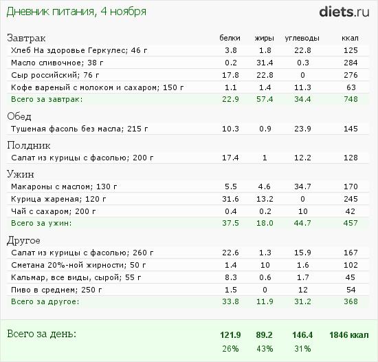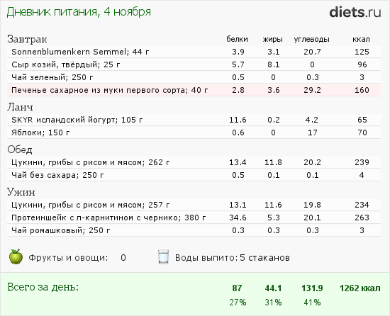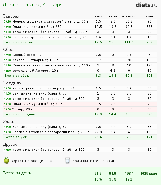 Я сегодня не добрала белка,снова,жиры в норме,угли тоже.На завтрак решила пожарить оладушки,и чего то я переборщила с ними,могла бы съесть и поменьше.