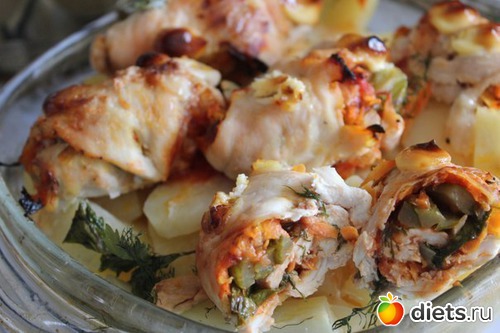 Выкладываем в форму, кладём туда же несколько зубчиков чеснока раздавленных ножом и запекаем в духовке при температуре 220 градусов сначала под крышкой или в фольге. Затем открываем и даём подрумяниться.