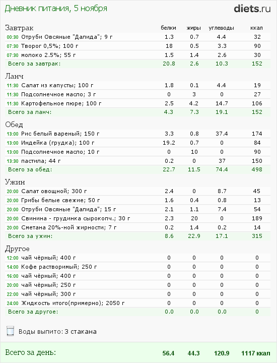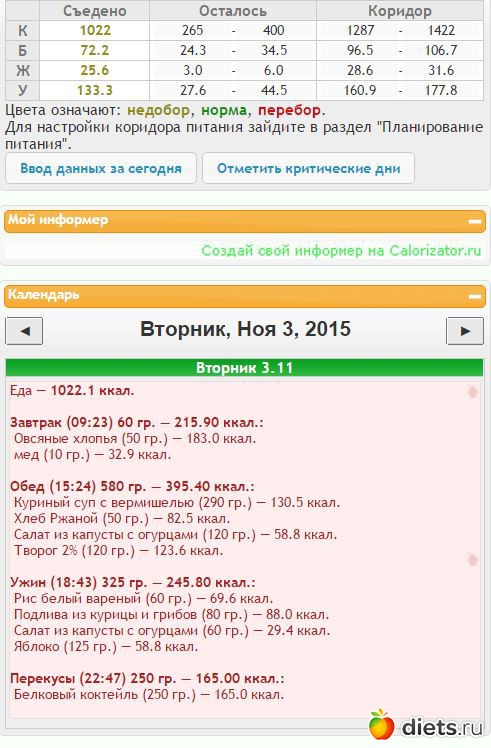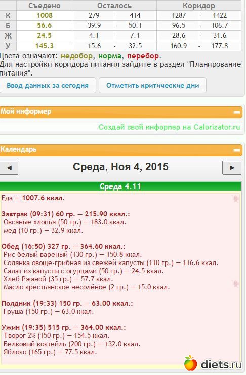 Девочки, ну вот послушала вас, посмотрела. Убрала жира, добавила белка какого могла ( очень мало готовим мяса). Но недобор все равно!! И, главное, я сыта целый день, ну может перед обедом, когда с развивалок с малым приходим, то уже голодные. А после обеда я себя чуть ли не заставляю есть!! Может быть, что я раньше питалась одними углеводами, а организм теперь обалдел от увеличения белка и насыщается? или все-таки мечта сбылась и желудок стянулся немного. Или без сладкого меньше жрать хочется. Или не знаю что. Ну гляньте за последних два дня- порции-то уже не маленькие! Единственное - между завтраком и обедом большой промежуток, но это мы с малым в школе пока, потом на площадку и в магазин.. Вот сегодня вышли в 10 пришли в 16 (это исключение, обычно мы в 13.30 дома). Надо будет себе йогурт или кефир брать для перекусов или что? Может сюда и орешки можна вдавить? и калории., думаю, доберуться