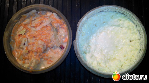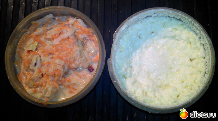 Вчерашний салат из редьки и прочего. Запеканка из творога и яйца.