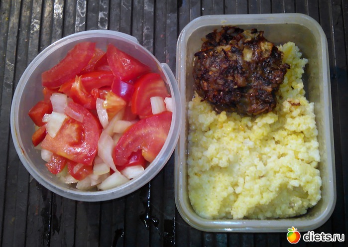 Ел одно и тоже, потому и объединил. Салат. Пшенная каша. И что-то вроде тефтельки из духовки. Передержал, от того и цвет такой.