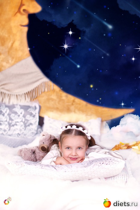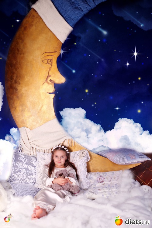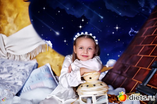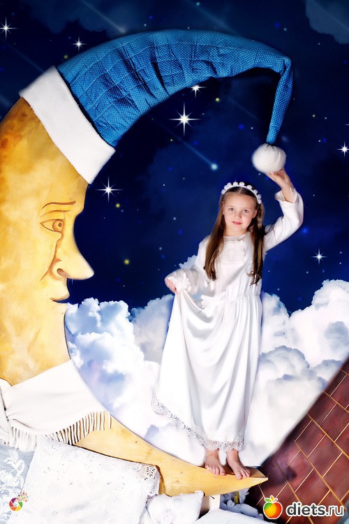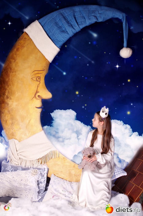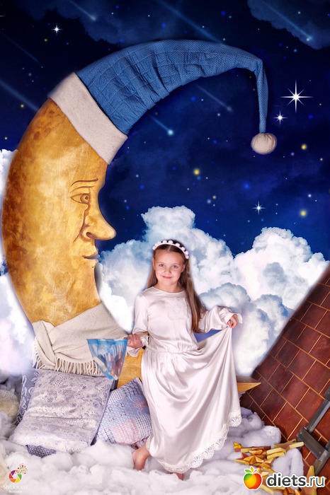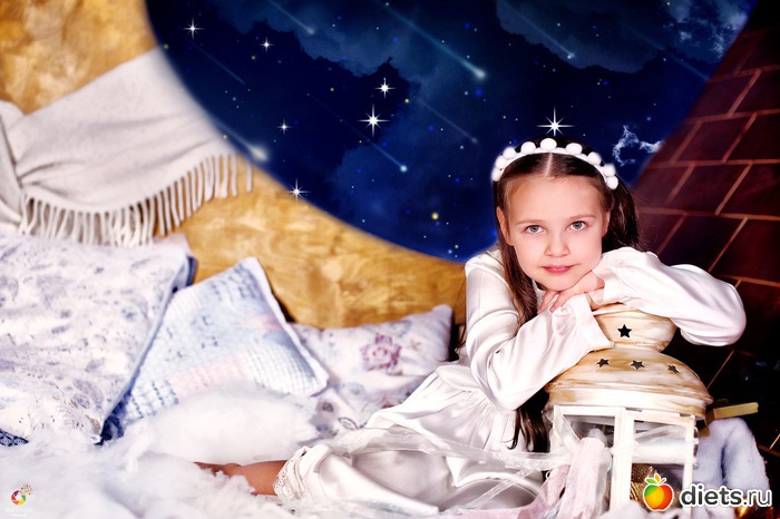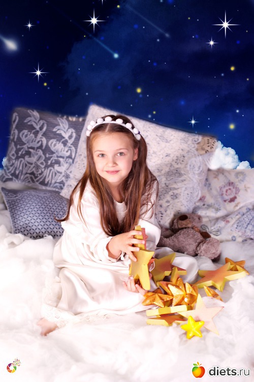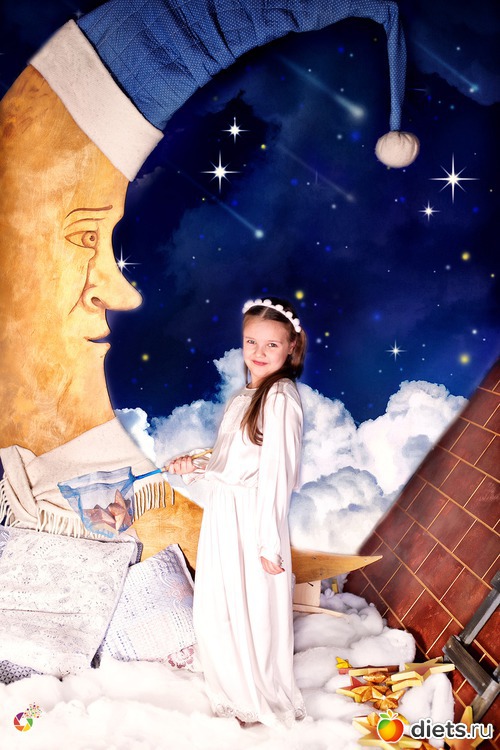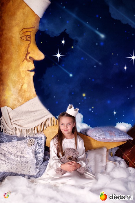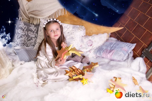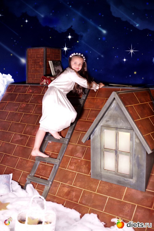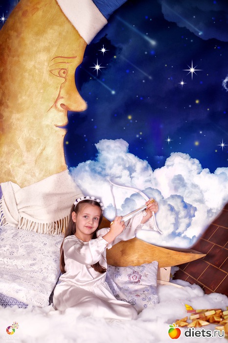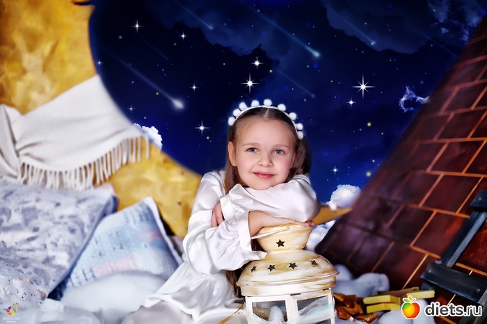 небольшой уголок приблизительно три на три. Размещают декорации, ставят освещение. Есть мини костюмерная по темам и с несколькими размерами. Касаемо конкретно этих декораций, они выполнены из прессованного картона. Помнишь у нас на пятилетие в прошлом году пони были из такого? Которых мы разрисовывали? Вот повесили они и поставили декорации, набросали подушек и мягкий материал вместо перин, переодели детей и фотографируют.