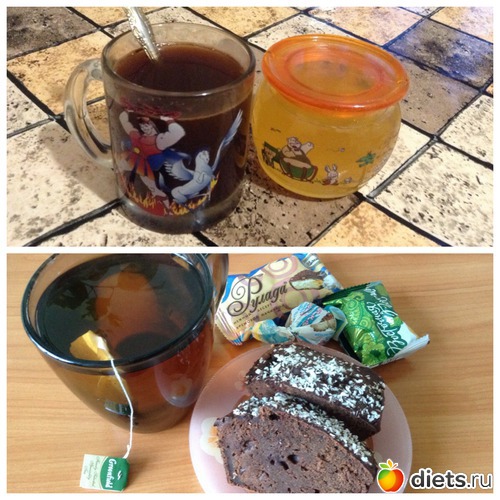 В обед попила чай с кексом, конфеты взяла с собой, потом с кофе/чаем перекушу...