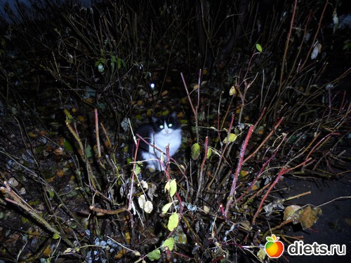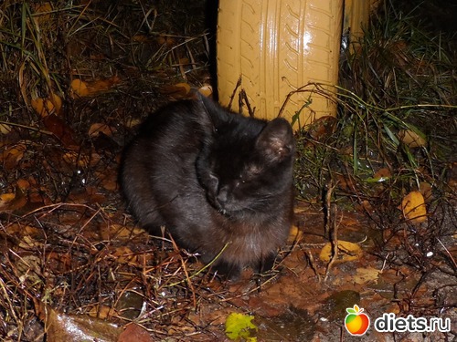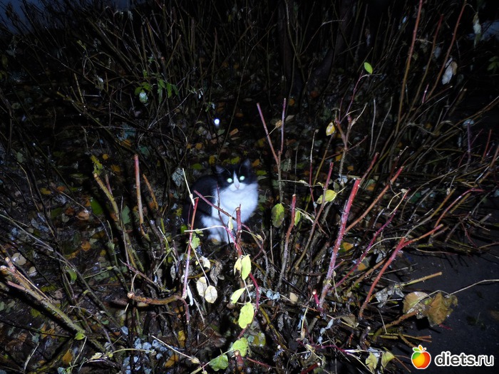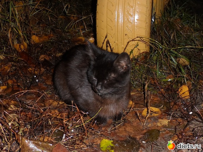 В кустах, около подъезда сидит кошка. Эта животина периодически ходит беременной.