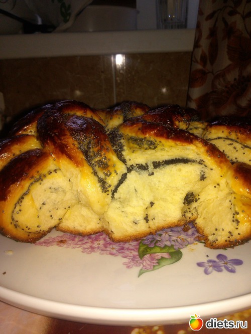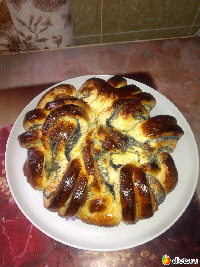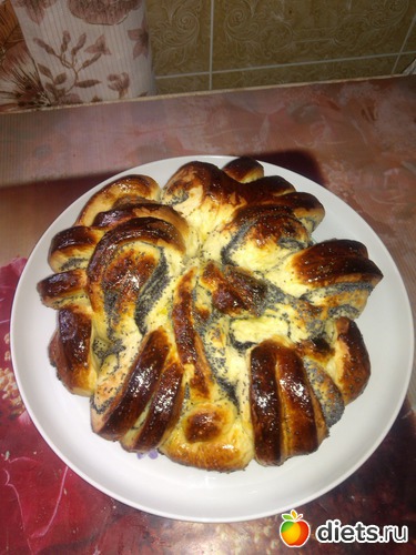 Выкладываем на тесто мак, смешанный с сахаром и небольшим количеством воды. Сворачиваем в рулет.