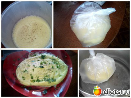 4. Теперь необходимо подготовить обыкновенный полиэтиленовый пакет или рукав для запекания. Аккуратно перелить яичную массу в него и плотно закрепить верх. Края должны быть скреплены хорошо, чтобы в процессе варки омлет не вытек.