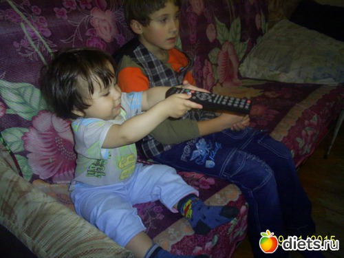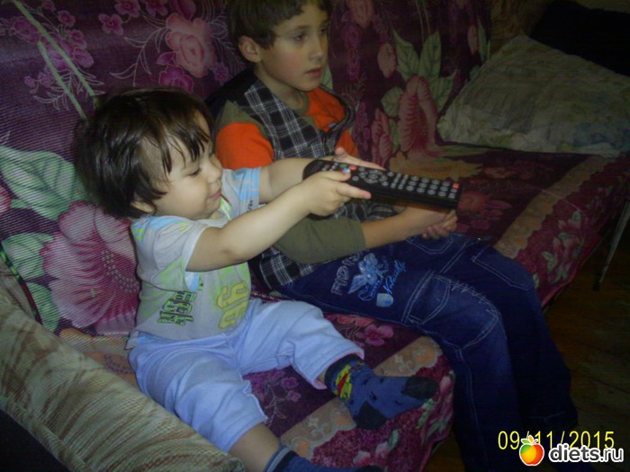 Ну и фото любимых внуков, как же без этого : старший только из школы пришел - такой усталый, а младший сразу к нему и за пульт: мультики включать...