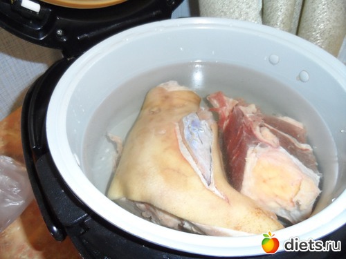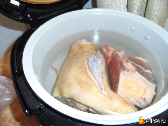 Тем временем в мультиварку отправляется свиная рулька и кусок говядины.