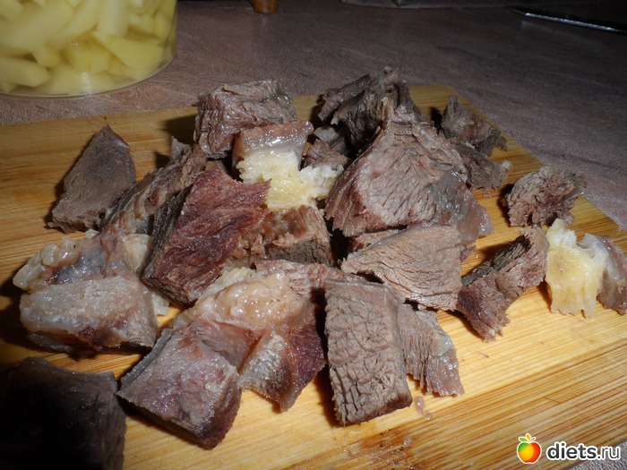 Мясо остыло. Рульку шпигуем чесноком, а говядину режем кусочками и отправляем в кастрюлю.