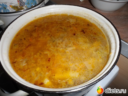 Бульон процеживаем, ставим на газ, закладываем перловку и продолжаем.